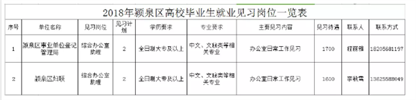 为提高高校毕业生就业能力,拓宽高校毕业生就业渠道,颍泉区妇联、颍泉区事业单位登记管理局等两家见习单位拟开发高校毕业生就业见习岗位4个,吸收2017、2018年度离校未就业的高校毕业生参加就业见习。