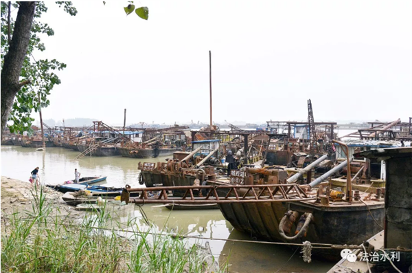 一排排统一编号的非法采砂船整齐停靠在霍邱县新河口河边,河道恢复了往日的宁静与美丽。霍邱县河道局局长赵玉河介绍,全县已对境内采砂船只全面摸底、登记、造册和编号,所有非法采砂船只全部实现了集中停靠、集中管理,严禁私自离开停靠点。