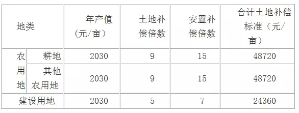 (3)耕地:土地补偿标准为48720元/亩,青苗补偿费标准为1100元/亩。总计耕地补偿标准为49820元/亩。