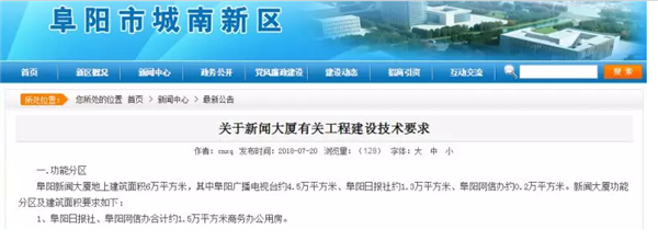 据了解,阜阳新闻大厦地上建筑面积6万平方米,其中阜阳广播电视台约4.5万平方米、阜阳日报社约1.3万平方米、阜阳网信办约0.2万平方米。项目位于城南新区润河路南侧、阜王路西侧,正位于双清湾公园路南,属于城南中心区域。新闻大厦项目作为所在地块的配套项目,由拍得土地的企业负责设计、建设。