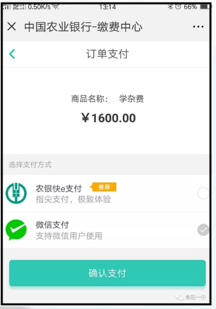 2、上图点击“下一步”跳转后,在“缴费金额”栏输入应缴金额(每生均为1600元),然后点击右下方“缴费”,跳转到订单支付界面,出现两种支付方式,根据自己情况选择微信支付和农银快e支付(农银快e支付需开通农行手机银行),点击下方“确认支付”,并按提示完成支付。如下图: