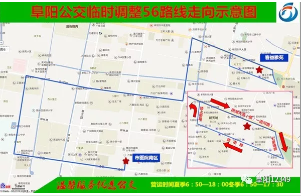 (注:公交56路线在西湖大道(原:一道河路)与颍上路交口→西湖大道(原:一道河路)→七里铺路→颍南路→颍上路→西湖大道(原:一道河路)与颍上路交口路段,单向环绕运营,途径“汽车南站”站、“春益雅苑”站、“春益雅苑南门”站、“天瑞山庄”站实行单边停靠,线路绕行期间,请广大乘客合理选乘其它线路或方式出行,以免耽误您的出行。)